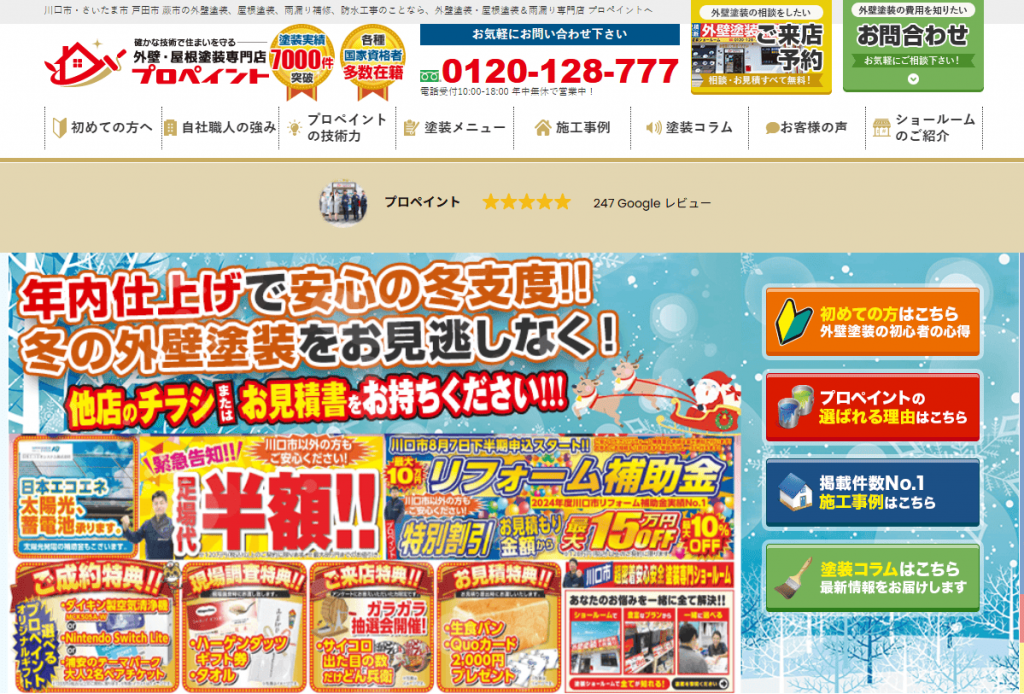 - 年中無休&ショールーム完備で相談しやすい:年中無休で営業しており、いつでも問い合わせ・相談に対応可能です。川口市内に塗装専門ショールームを構え、豊富な塗料見本やシミュレーションソフトで実物を見ながら打ち合わせできるのも大きな強みです。