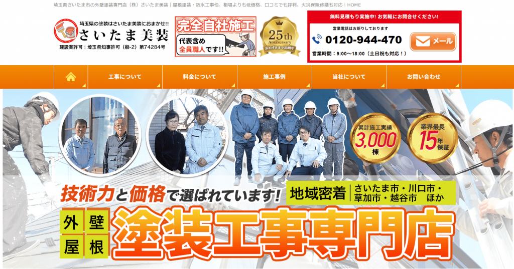- 地域密着の丁寧な対応と充実アフター::川越市・所沢市・さいたま市を中心に地域密着で親身な対応が評判です。無料相談・無料見積りはもちろん、施工後の定期点検などアフターサービスも充実しています。