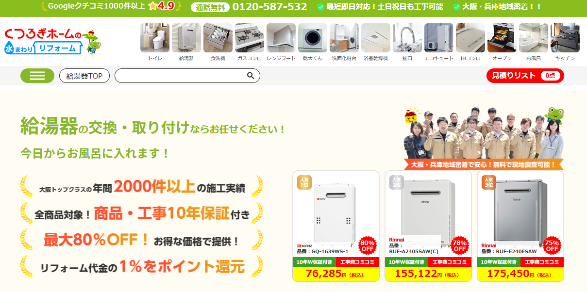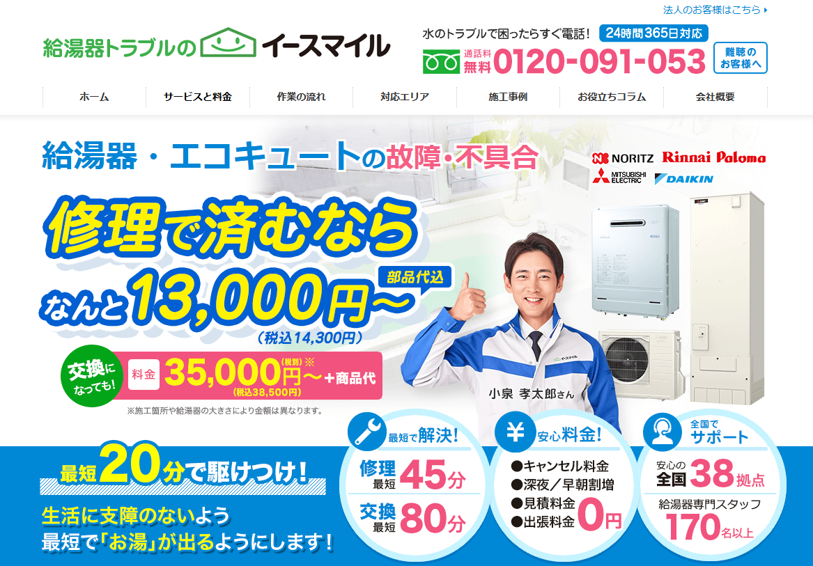 全国区のテレビCMでも知られるイースマイルは、大阪市内のスピード対応に強みがあります。スタッフの礼儀や説明の丁寧さにも定評があり、初めての給湯器交換でも安心して依頼できます。24時間365日の受付体制で、急な故障にも対応できるため、暮らしの安心を重視したい方に向いています。大手ならではの保証体制も魅力です。