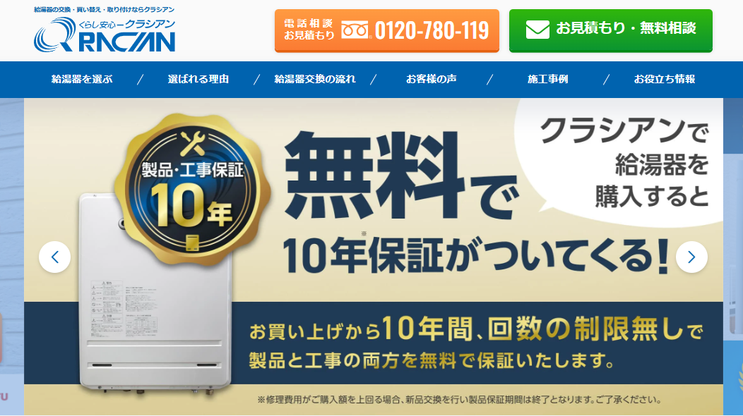 クラシアンは全国最大級の水まわり修理業者で、大阪市でも広く知られています。「くらし安心クラシアン」の名の通り、点検無料・明朗会計・迅速対応で信頼性が高い業者です。給湯器交換だけでなく、周辺の水まわりトラブルにもまとめて対応できるため、主婦の方にとって使いやすいサービスです。