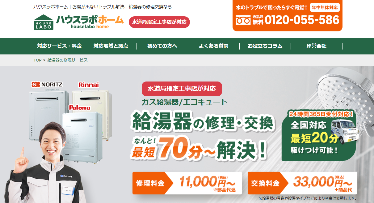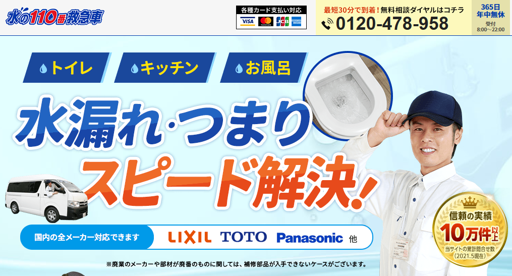 水の110番救急車は、緊急トラブルに強い水まわり修理業者です。給湯器交換も対応しており、24時間365日の受付で夜間や早朝の相談にも乗ってくれます。急な故障やお湯が出ないトラブルが発生したときに頼りやすく、訪問スタッフの対応が丁寧な点も高く評価されています。