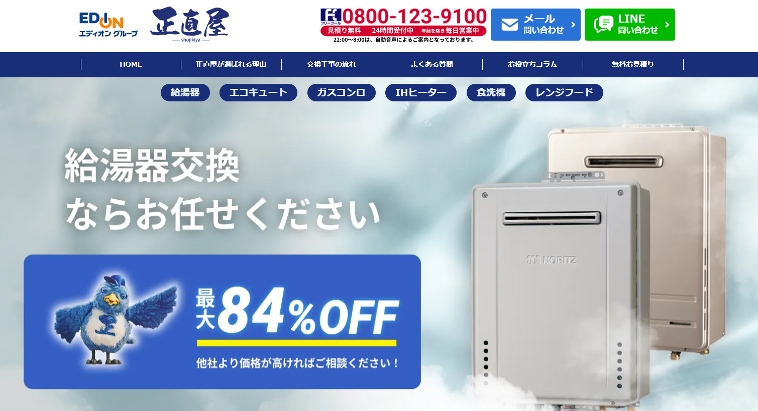 | 料金 | 給湯器本体の大幅割引+交換工事費(コミコミ価格) |