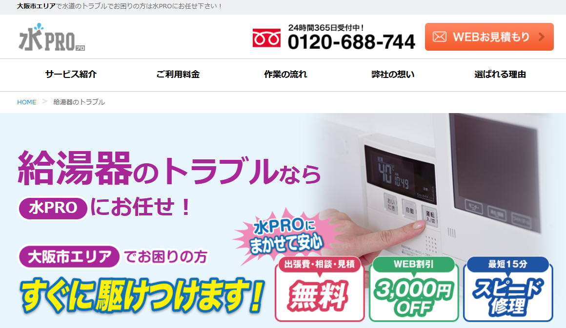 水PROは、大阪市での即日対応の早さに定評がある業者です。水まわりの緊急トラブルに強く、給湯器交換にも柔軟に対応しています。料金体系もわかりやすく、追加費用がかかりにくい点が主婦の方から支持されています。信頼できる専門スタッフが訪問し、丁寧に状況を説明しながら作業を進めてくれるため、安心して依頼できます。